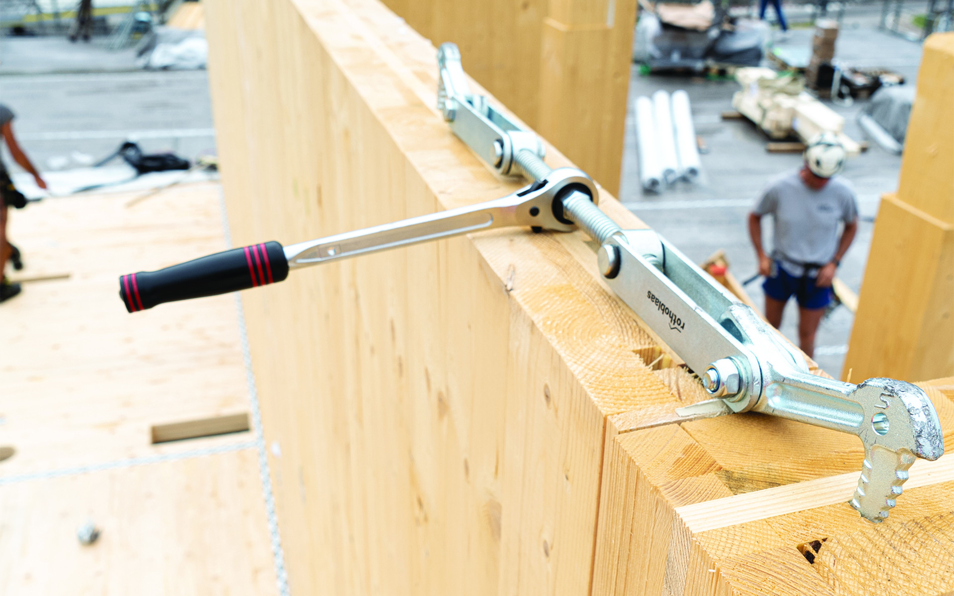Una primera e importante herramienta de carpintero es el tiravigas. Por más esmerada que sea la prefabricación, casi siempre es necesario apretar o alinear perfectamente los elementos constructivos de madera antes de fijarlos. El tiravigas de Rothoblaas se llama SKORPIO y está dotado de unas puntas afiladas que se clavan en la madera y de una llave de carraca que aprieta los paneles y las vigas. Es la herramienta ideal para apretar rápidamente los elementos constructivos antes de su fijación final. La única herramienta adicional que se requiere es un martillo para clavar las puntas en la madera.