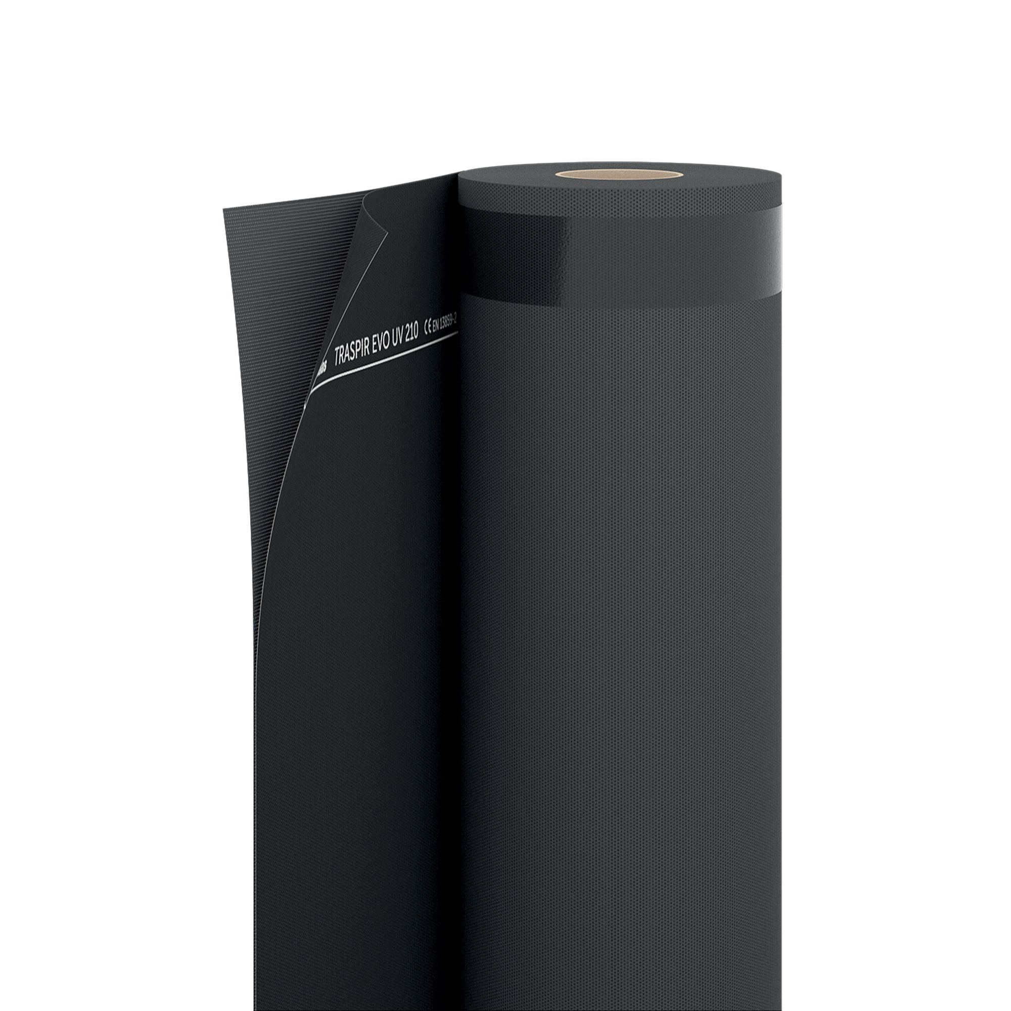 TRASPIR EVO UV 210, lámina altamente transpirable monolítica, resistente a los rayos UV: ideal para fachadas ventiladas con juntas abiertas de hasta 50 mm y hasta el 40 % de superficie descubierta, con reacción al fuego B-s1, d0 y estanquidad W1.