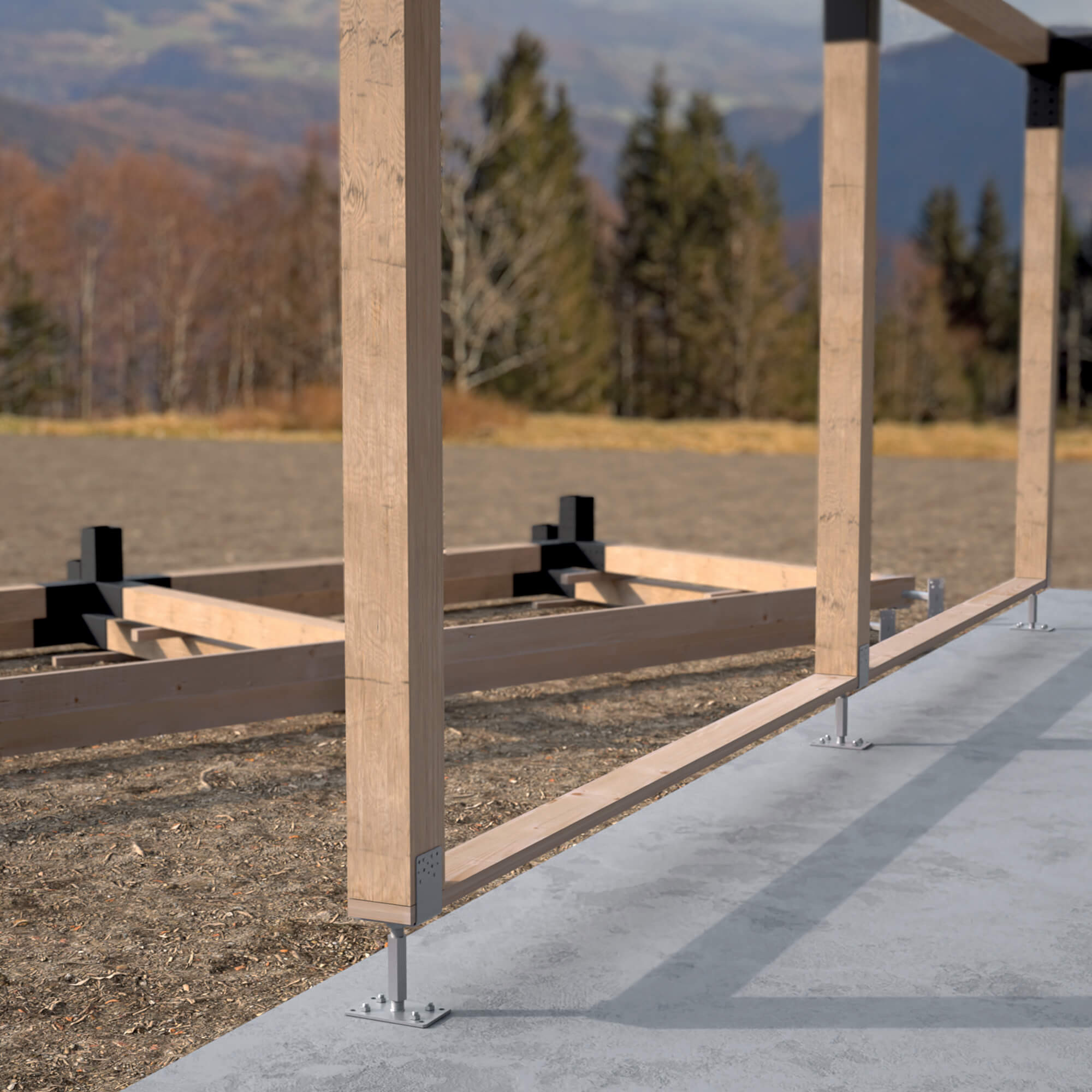 La placa base, con doble perforación para los anclajes, permite instalar el pie de pilar incluso cerca del borde del soporte de hormigón.