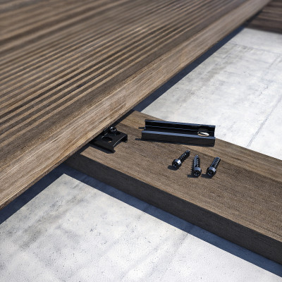 El conector oculto TERRALOCK para terrazas y revestimientos de fachadas asegura fijaciones completamente escondidas en las tablas de madera.