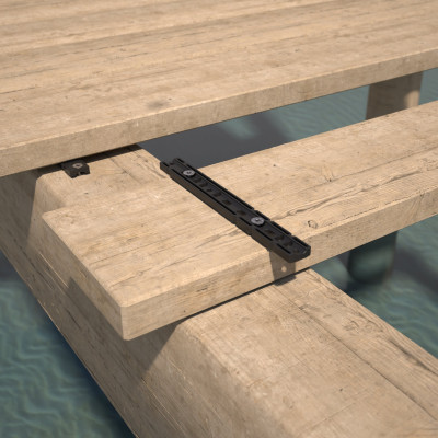 La superficie de apoyo amplia asegura la usencia total de aplastamientos de la subestructura. El tope de montaje colabora al posicionamiento preciso de cada conector; los agujeros con ojal permiten acompañar los movimientos de la madera.