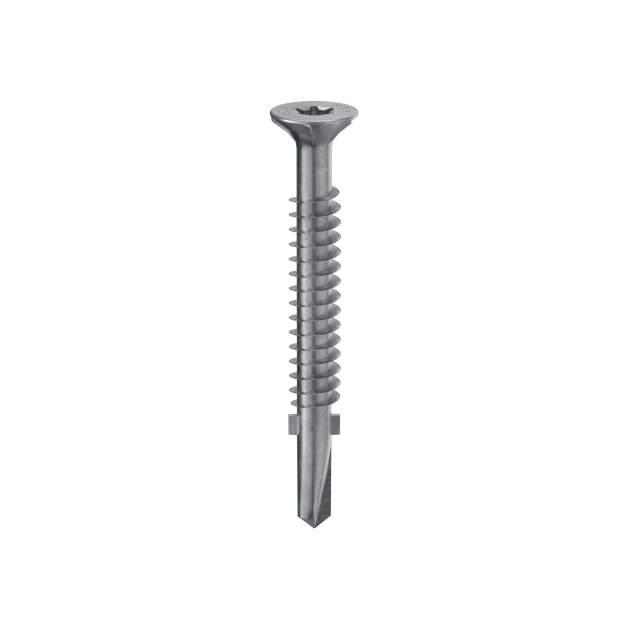 La punta autoperforante con geometría de ventilación asegura un excelente rendimiento de agujereado tanto en aluminio como en acero, mientras las aletas protegen la rosca del tornillo durante la penetración en la madera.