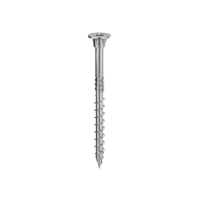 En acero inoxidable martensítico AISI410 con excelente relación entre resistencia mecánica y resistencia a la corrosión, utilizable sin pre-agujero sobre tablas en madera con densidad máxima de 780 kg/m3 y con pre-agujero sobre tablas en WPC. Clases de servicio 1, 2 y 3.