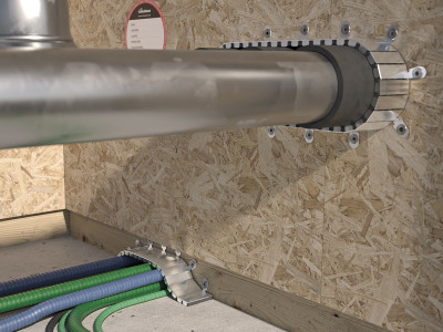 Solución universal, UNICOLLUM puede cortarse directamente en la obra y adaptarse también a diámetros grandes. Certificado para el sellado de pasos de instalaciones mecánicas y eléctricas, en paredes y forjados.