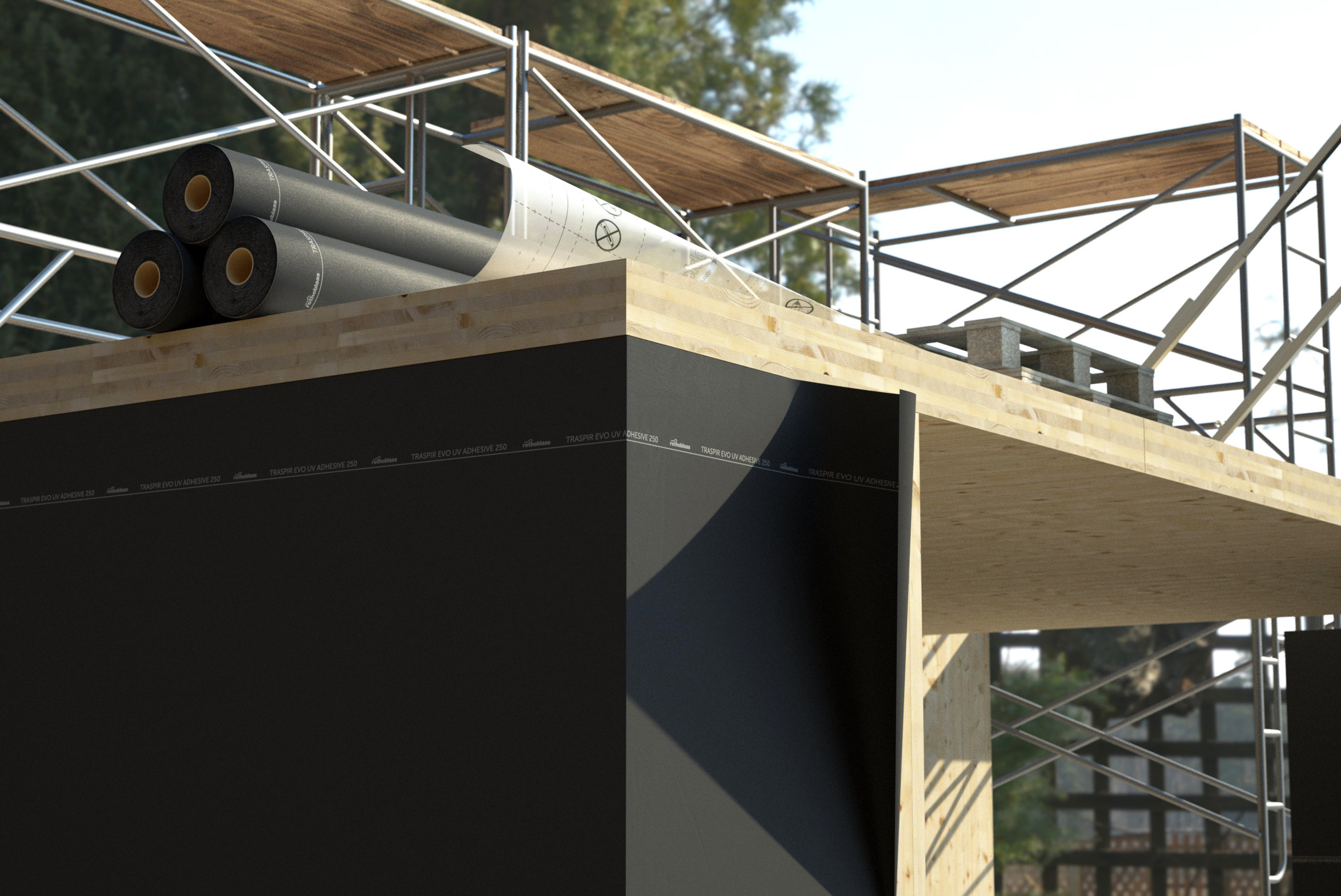 La superficie adhesiva evita la formación de flujos de aire detrás de la lámina en caso de roturas accidentales o de falta de sellado. La superficie completamente autoadhesiva de la lámina permite una colocación rápida y segura: es adecuada para la preinstalación en fábrica y protege los elementos de CLT durante el transporte y las fases de construcción.