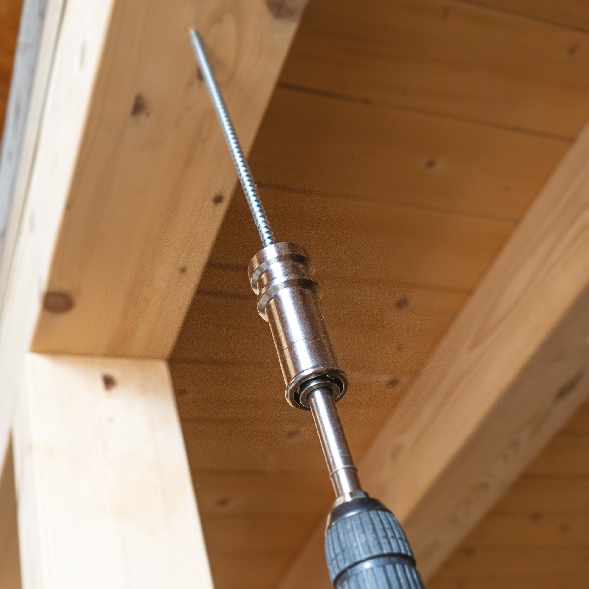 La herramienta de atornillado CATCH ha sido desarrollada para el atornillado rápido, seguro y sin esfuerzo de tornillos largos para madera con un taladro atornillador. La cabeza del tornillo se fija firmemente a la herramienta CATCH de manera que la punta bit no se suelte al accionar el atornillador.