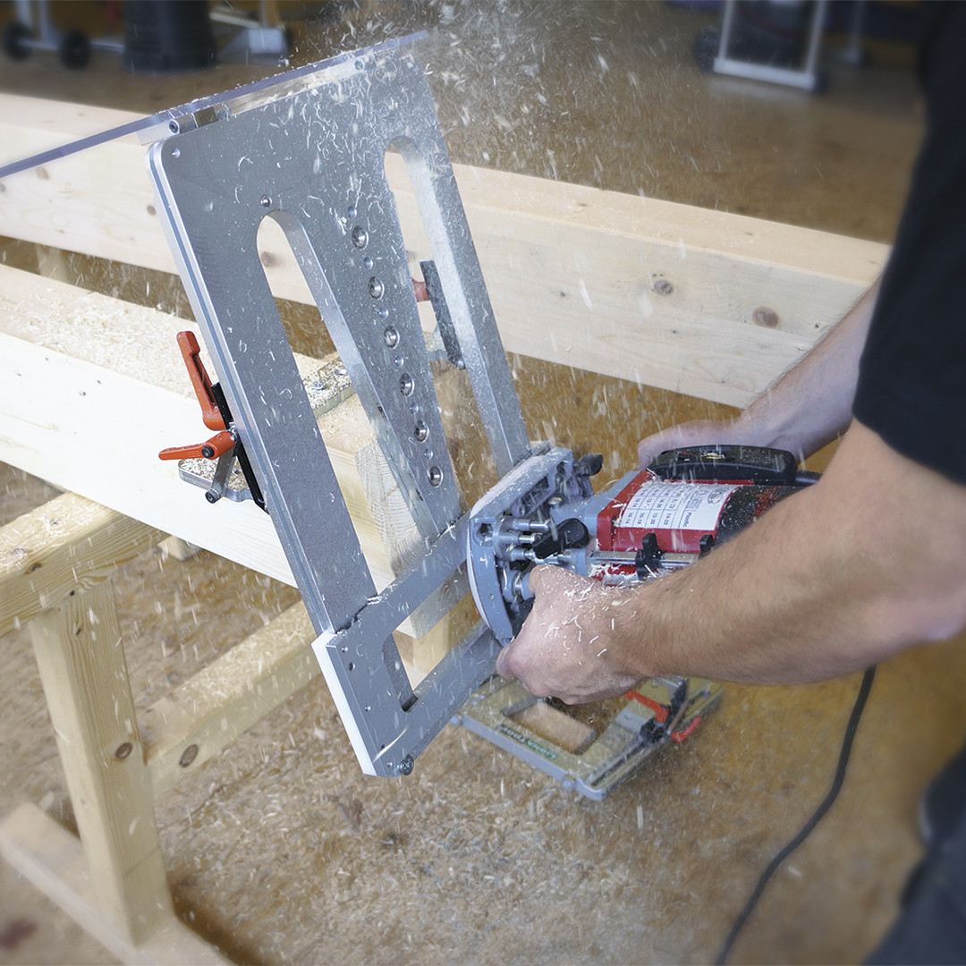 El suministro incluye: Systainer, plantilla perforada para viga principal y secundaria, dispositivo de guía, adaptador para fresadora vertical Mafell LO 65 Ec, tope de profundidad, tope lateral, tope horizontal x2, portaherramientas
