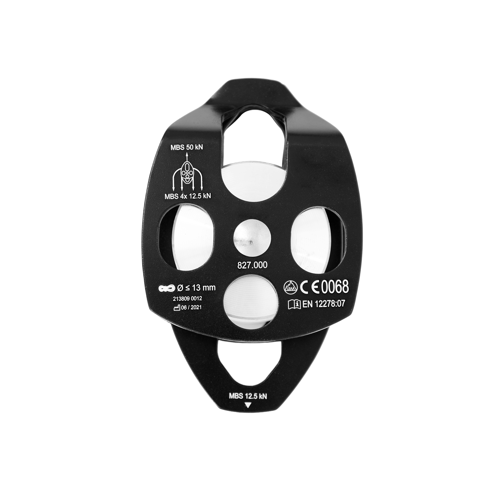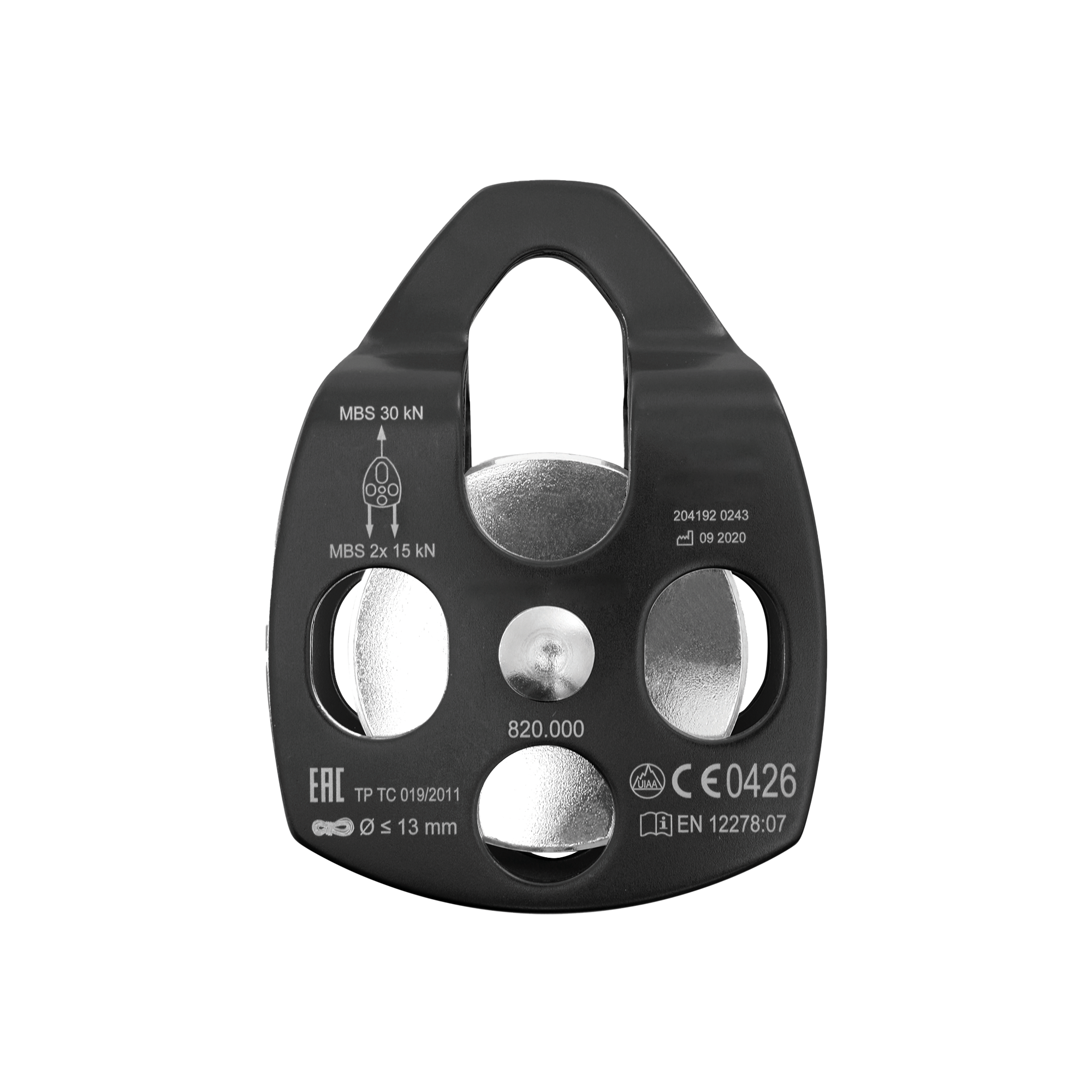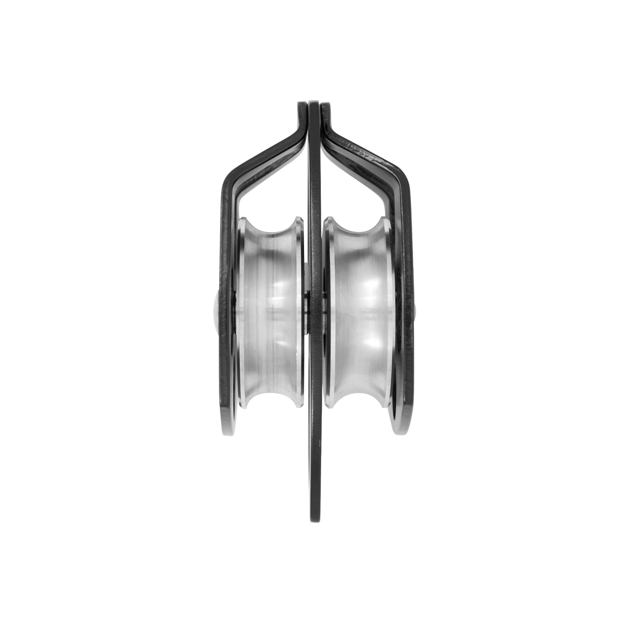 La versión DOUBLE está dotada de dos puntos de conexión para el uso en sistemas de elevación complejos. Como el motón es de color negro, se nota poco, por lo que es ideal para pasar desapercibido.
