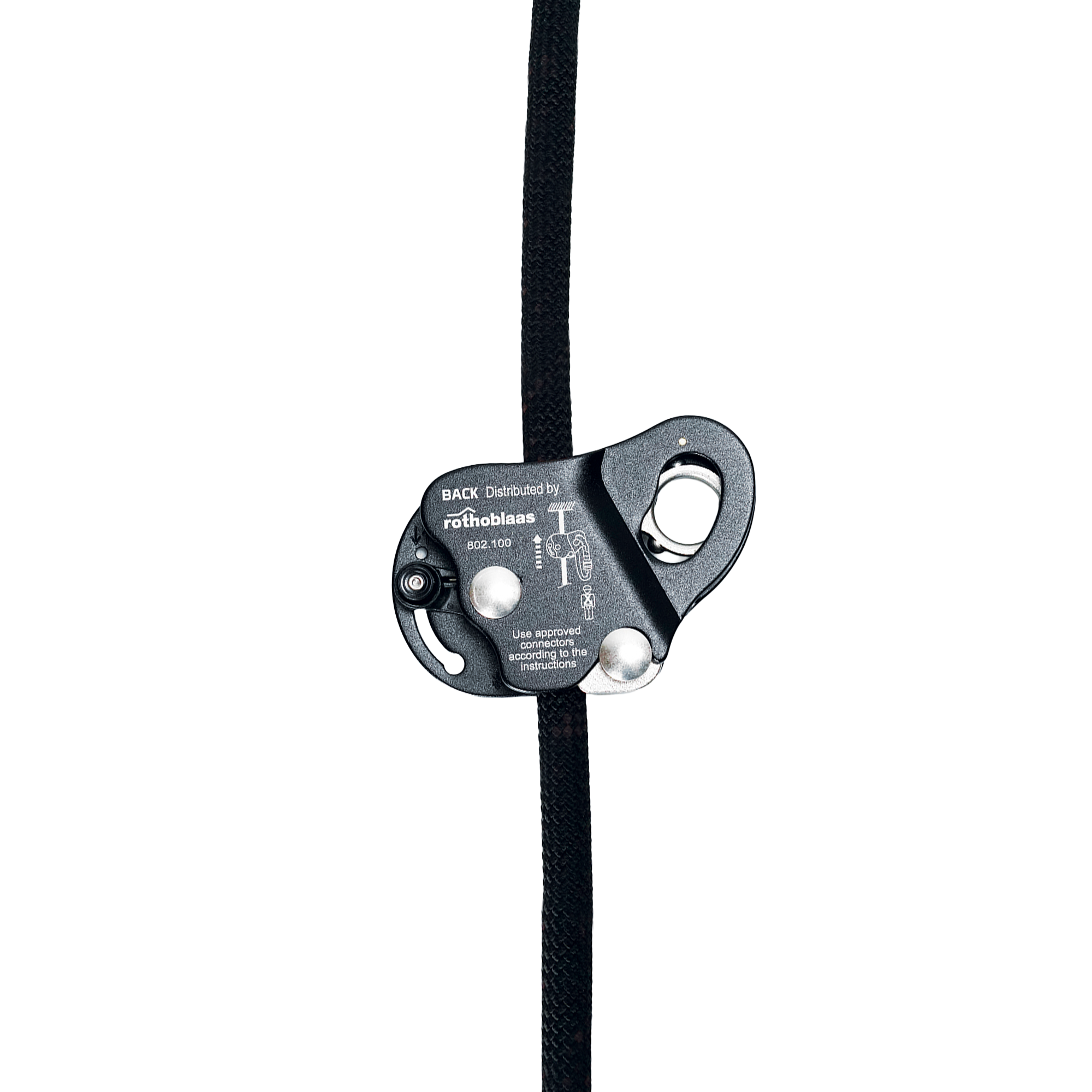 Dispositivo de acero inoxidable y aleación de aluminio. Incluye mosquetón de acero con virola autobloqueante. Equipado de un botón correspondiente para el paso de detención de caídas de posicionamiento.