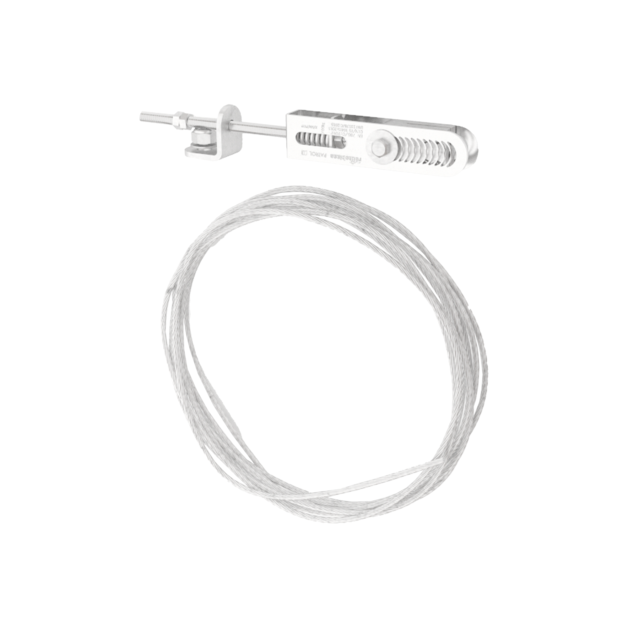 El kit de línea de vida incluye 2 terminales PATROLTERM, 2 disipadores de energía SPEAR, 1 elemento intermedio no pasante PATROLMED y un cable CABLE de 30 metros.