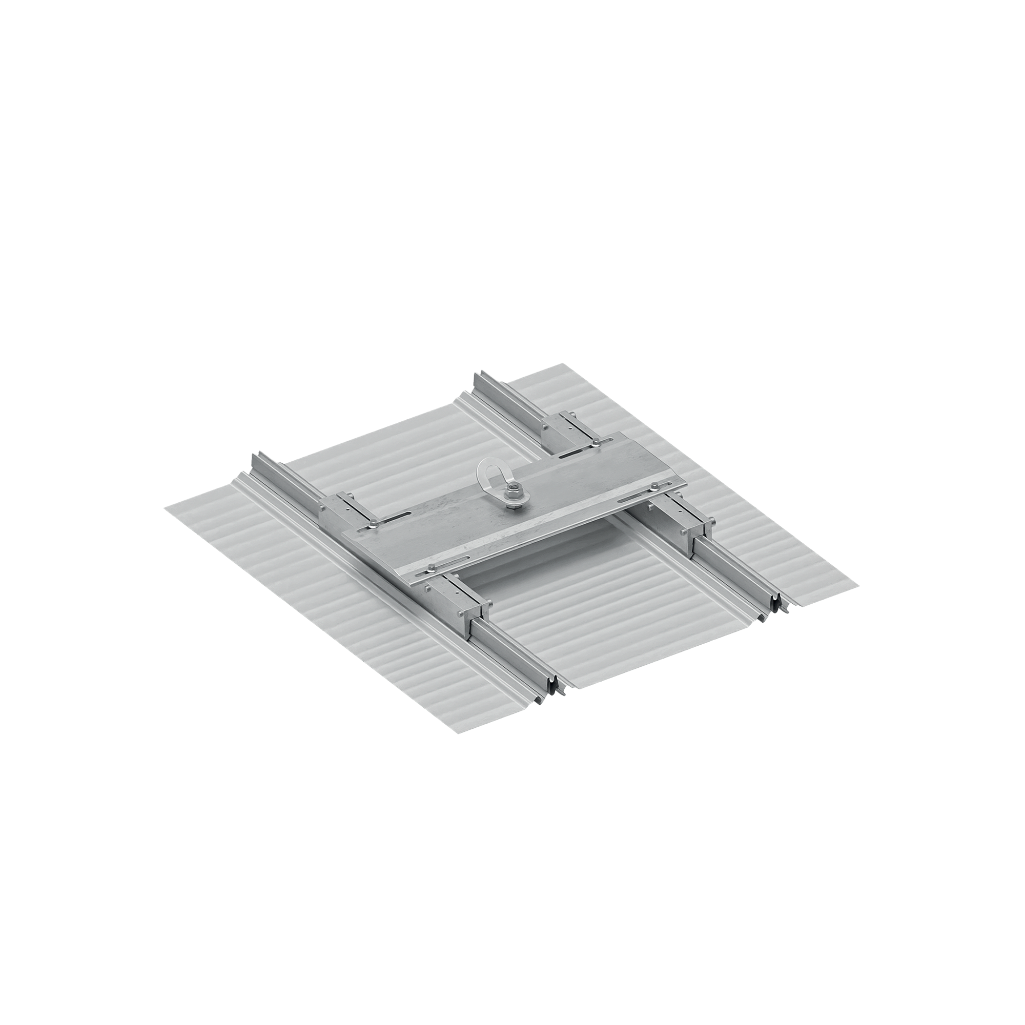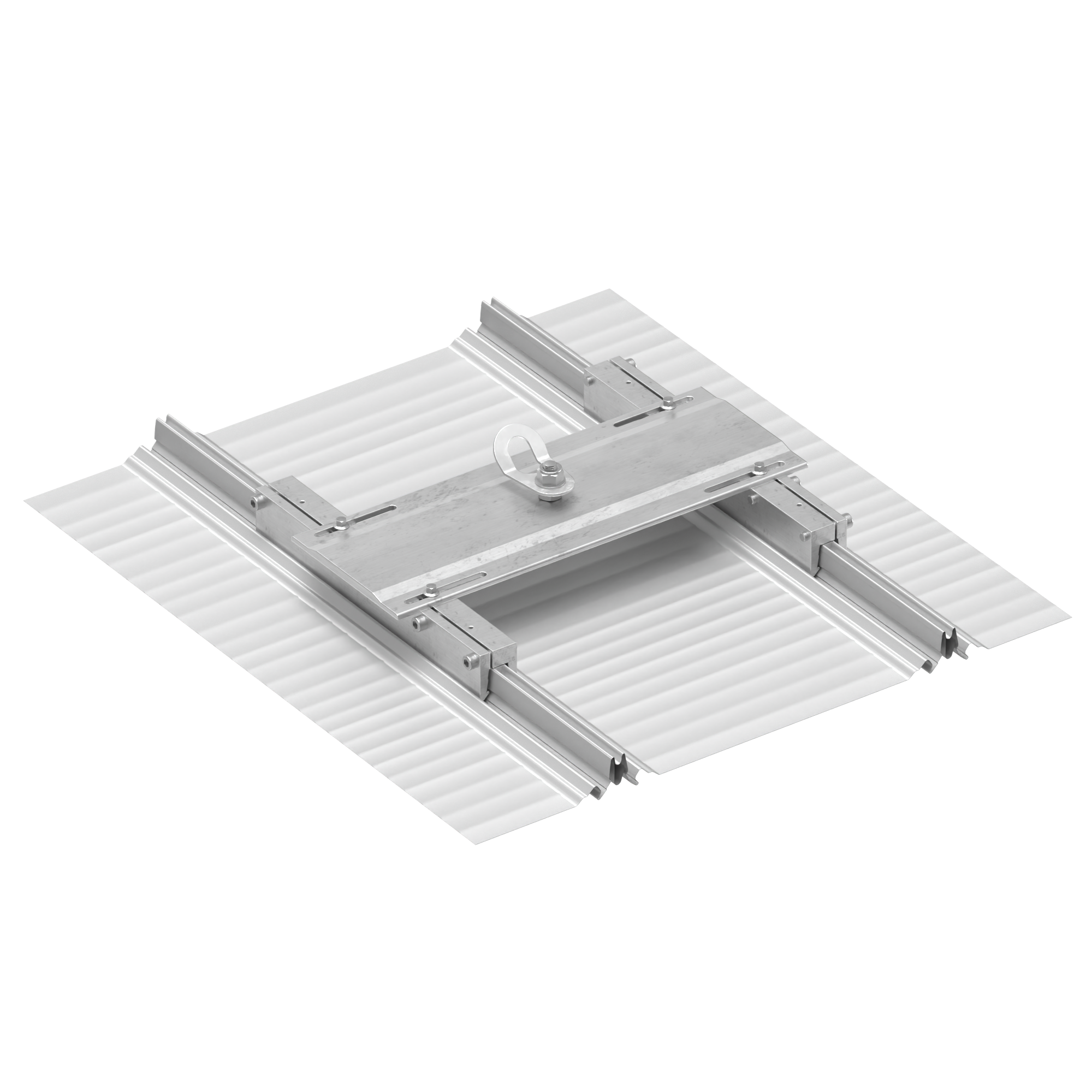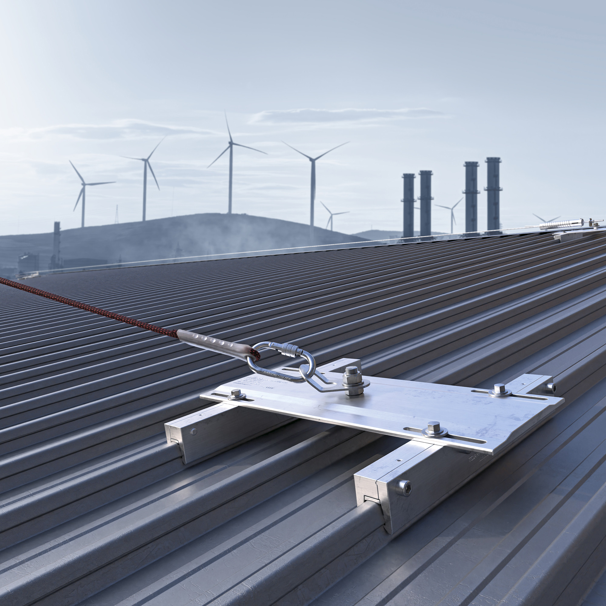 Sistema versátil con mordazas específicas que permiten la instalación en diferentes tipos de cubiertas metálicas.